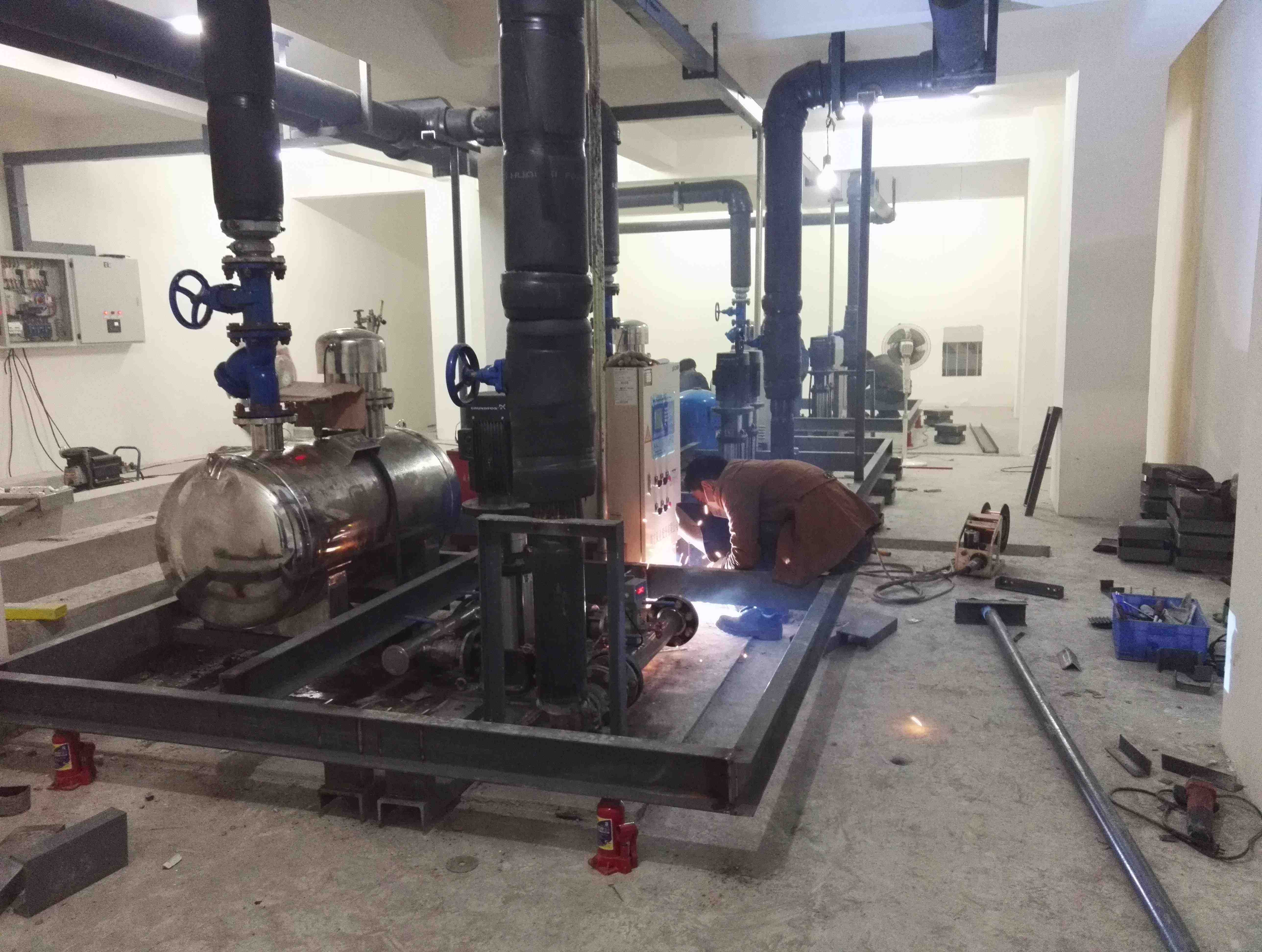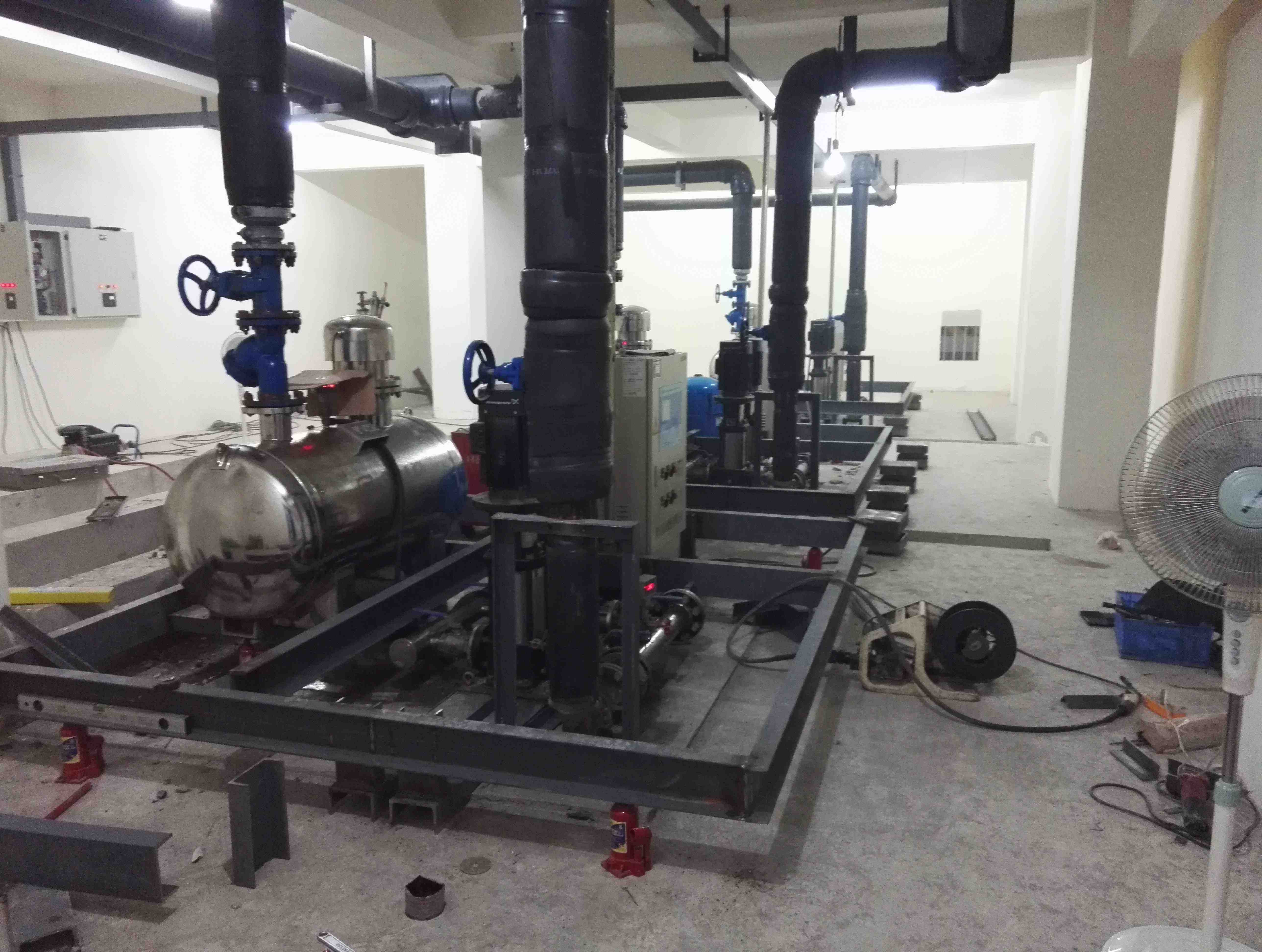 噪聲產生原因:我們認為水泵基礎沒有進行精確減振、管道沒有進行軟連接和減振處理,水泵機組的低頻振動沿著樓板、柱頭、墻壁向樓上傳播,導致樓上樓業(yè)主房間墻壁、地板、天花板、柱頭振動明顯,房間內低頻噪聲嗡鳴聲非常嚴重,雖然A聲級測量為39分貝,好像超標不是太多(標準為35分貝),此類噪聲頻率低,分貝數不高,但對人體影響較大,由于噪聲的頻率集中在150-500赫茲,對人體大腦產生大量的@電波,引起人體煩惱度增大。水壓管道水流聲共振、水箱進水脈沖等噪聲是影響樓上業(yè)主家里聲環(huán)境的主要因素,為此我們確定我們的施工方案與降噪目標。